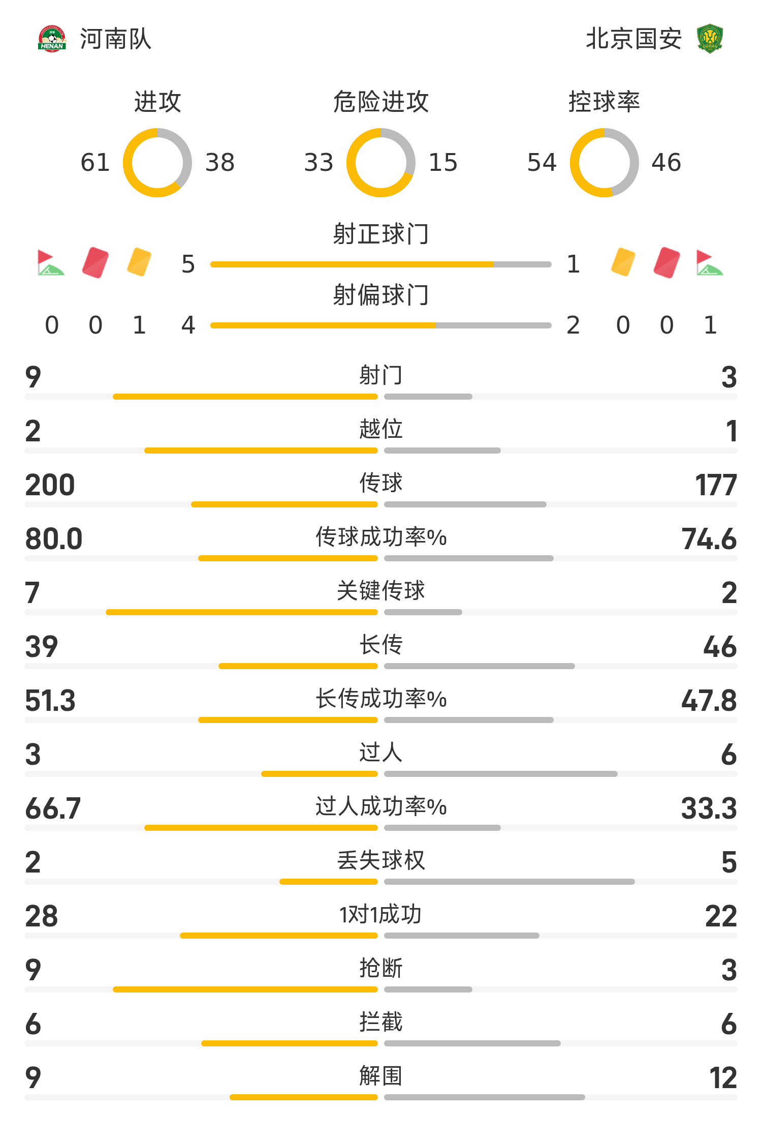技术统计河南队首发阵容:18-王国明、36-迈达纳、23-马亚、4-叶力江、6-王上源、40-纳萨里奥、22-黄锐烽、13-阿卜杜肉苏力、11-阿奇姆彭、7-钟义浩、9-卡多索