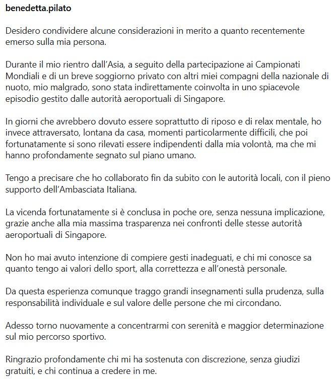 在被释放回到意大利之后,皮拉托在社交媒体发文,指责队友在她不知情的情况下,将偷来的赃物藏在了她的包里。